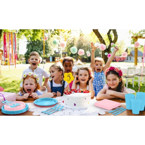 This 350-piece set of pink and blue disposable tableware is perfect for any upcoming event. With an extensive assortment of plates, cups, utensils, and more, you'll have all the necessary supplies for your guests. Save time and effort with this convenient and stylish set.