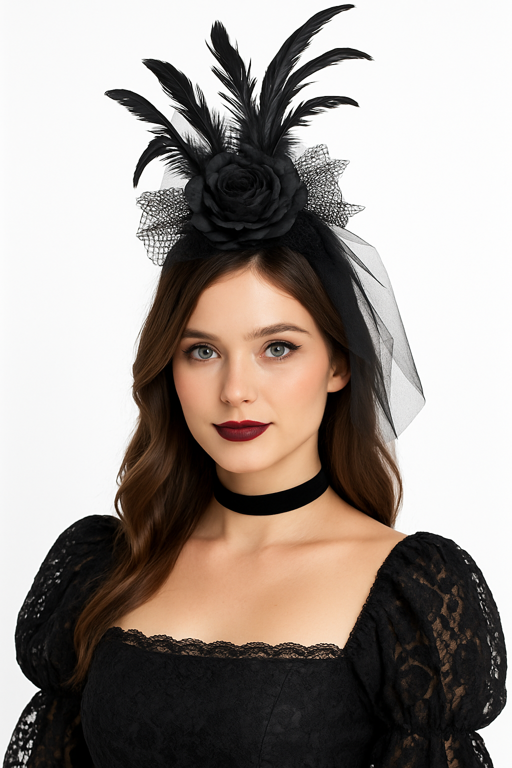 Add an air of dark elegance to your Halloween ensemble with this Deluxe Gothic Black Fascinator Headband. Inspired by Victorian charm, it features a glittering black rose, iridescent feathers, and a mysterious sheer netted veil. Perfect for vampire or gothic-themed costumes, this one-size accessory fits most teens and adults. Crafted from quality fabric and feathers, it measures 4" x 7.5" and is sure to captivate at any event.