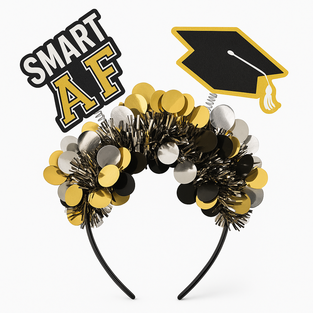 Celebrate your graduation in style with this playful "Smart AF" headband. Featuring a dynamic design with gold and silver embellishments and a fun graduation cap add-on, this headbopper is perfect for showcasing your accomplishments. Lightweight and comfortable, it's an essential accessory for any proud graduate ready to make a striking statement at their celebration.