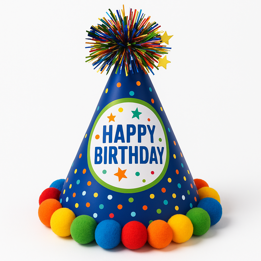Celebrate a special day in style with this vibrant Happy Birthday Cone Hat! Featuring a cheerful blue base adorned with bright confetti dots and a festive "Happy Birthday" headline, this hat is perfect for adding flair to any birthday party. The top is crowned with a sparkling tinsel pom, while a playful fabric pom-pom border decorates the bottom edge. Made from durable cardstock and fabric, this one-size-fits-most hat includes an attached elastic strap for secure wear. Ideal for both teens and adults, this 6.25" x 8.25" (15.8 x 20.9 cm) hat is a must-have accessory for unforgettable birthday celebrations.