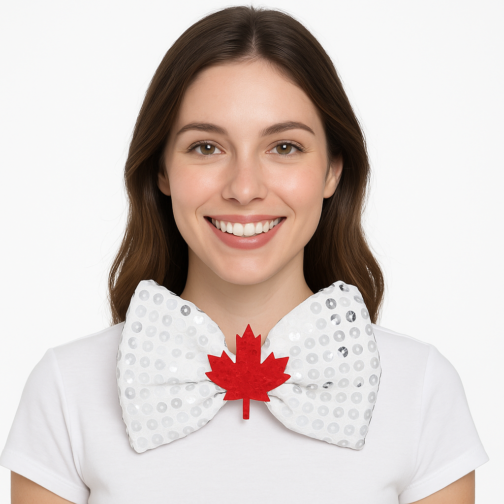 Show off your Canadian pride with this stunning Maple Leaf Sequin Bow Tie, perfect for Canada Day celebrations. This red and white accessory is adorned with shimmering sequins and features a bold maple leaf at the center. Designed to fit most, it’s an effortless way to celebrate your home and native land. Ideal for patriotic events or everyday wear, this bow tie is spot clean only, ensuring it stays vibrant and eye-catching.