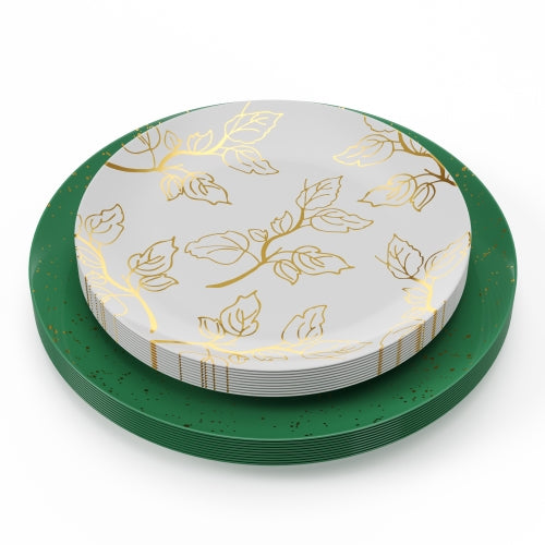 This pack contains 20 plastic plates hot stamped with gold sparkles on a green base and 20 smaller white plates hot stamped with gold floral motifs. Our elegant plastic plates are crafted to offer both sophistication and convenience, allowing you to create an effortlessly chic table arrangement without the fuss. These plates serve as a stylish complement to your culinary presentations, blending seamlessly with any table decor to enhance the overall dining ambiance. Ideal for those who prioritize both flair and functionality, these plates are the perfect choice for showcasing your impeccable taste.