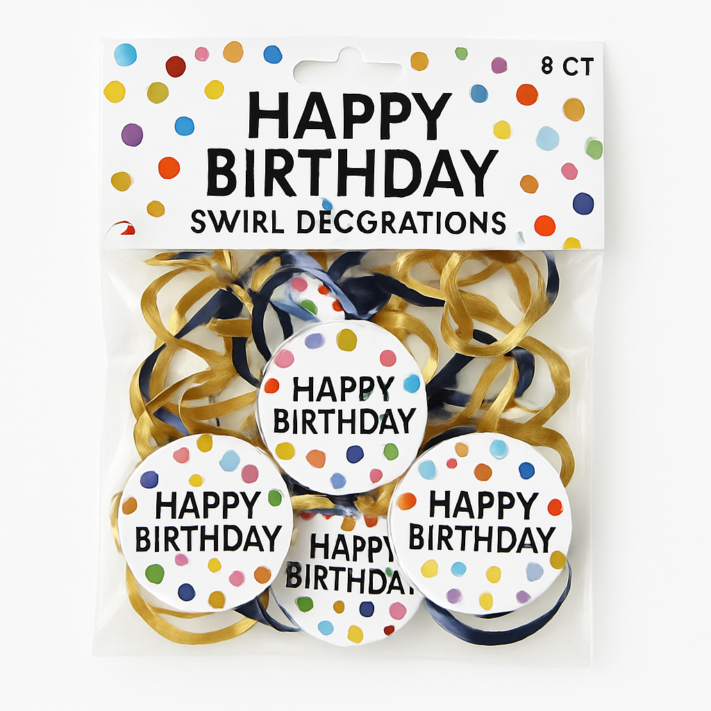 Elevate your birthday celebration with our vibrant Multi-Coloured and Metallic Gold Happy Dots Birthday Swirl Decorations! These dazzling hanging foil decorations feature festive circular cut-outs with cheerful slogans like "Happy Birthday," "Let's Celebrate," and "Party Time!" Perfect for any party space, the swirls add a splash of color along with elegant gold detailing. Easy to hang with tape, pins, or Sticky Tack (sold separately), these decorations make set-up a breeze. Crafted from durable cardstock and measuring 7 inches, each package includes 12 delightful swirls designed to shine at your next event. Celebrate in style with this must-have party decor!