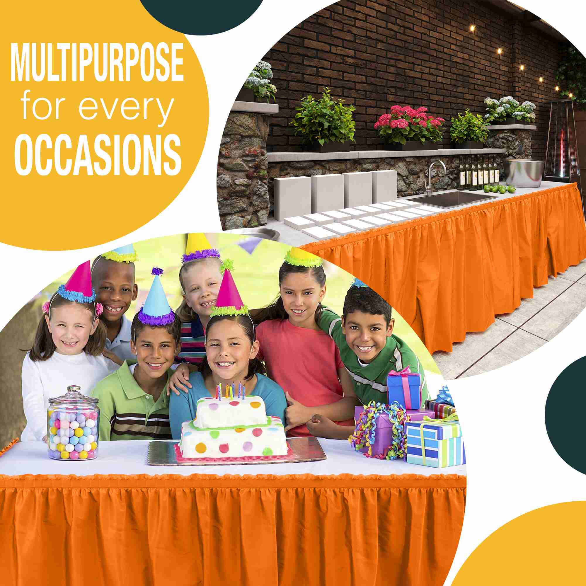 Table skirts are made from high quality water and oil proof plastic to ensure its long-lasting durability.