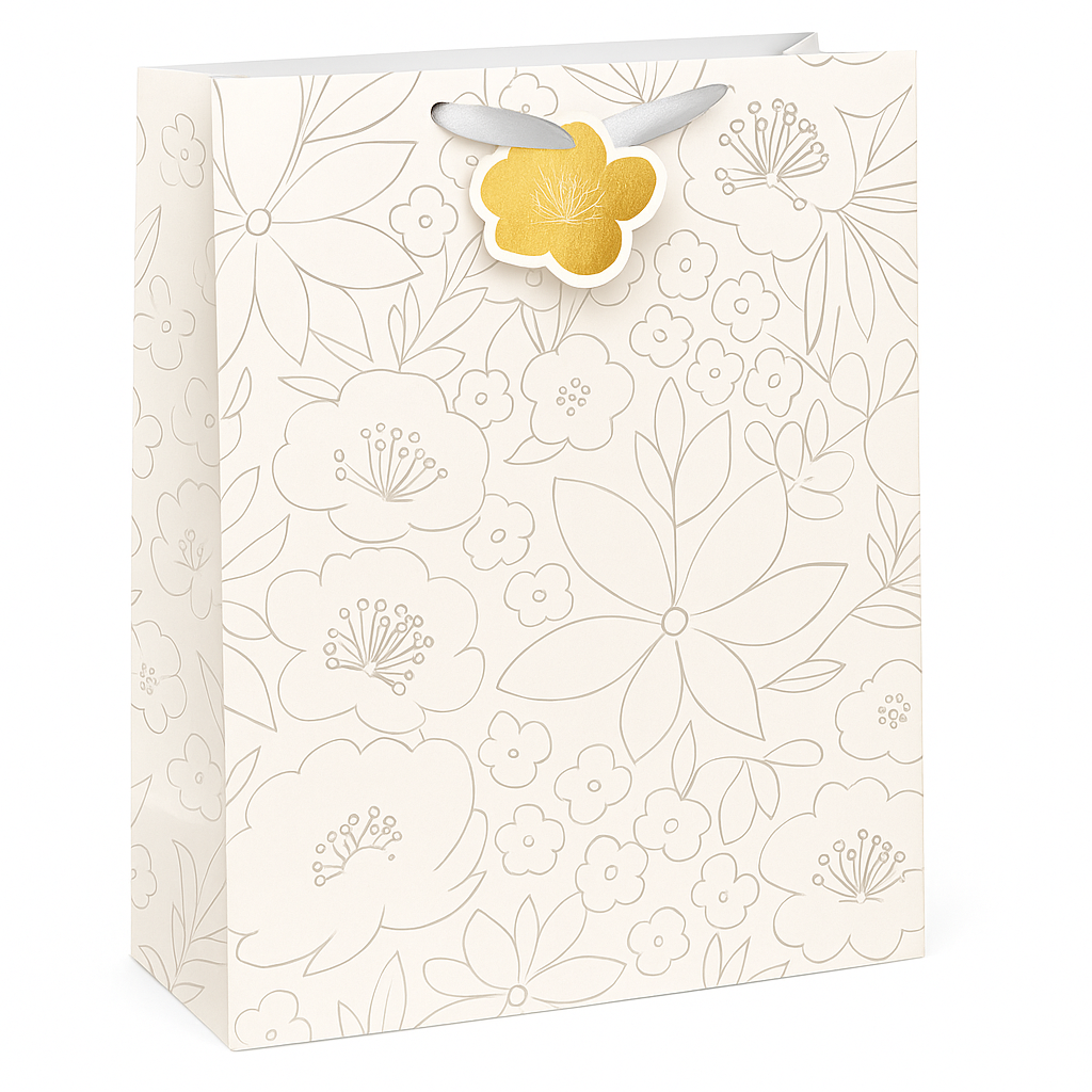 Elevate your gift presentation with this Extra Large Floral Embossed Gift Bag. Perfect for any occasion, it features an elegant floral print and a matching flower hang tag. Made from matte paper, the bag includes a convenient ribbon handle for easy carrying. With dimensions of 17" x 12.5" x 6" (43 x 31.7 x 15.2 cm), it provides ample space for your thoughtful gifts, adding a touch of floral charm to your wrapping.