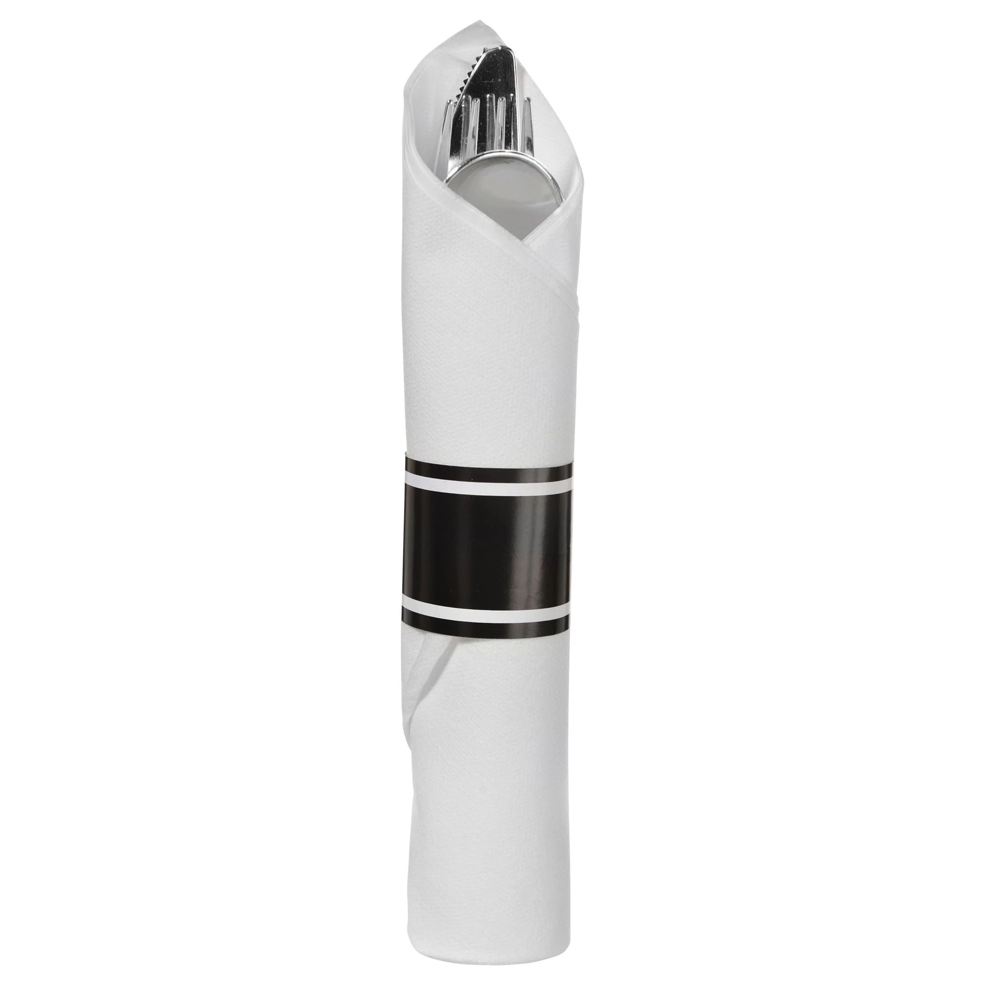 It's simple to set an attractive table with Rolled Cutlery Sets! Each set comes with a silver fork, knife, and spoon rolled in a super absorbent, white airlaid napkin. The plastic cutlery features a reflective metallic finish, and each set comes secured with a black band, ready to set on your table.