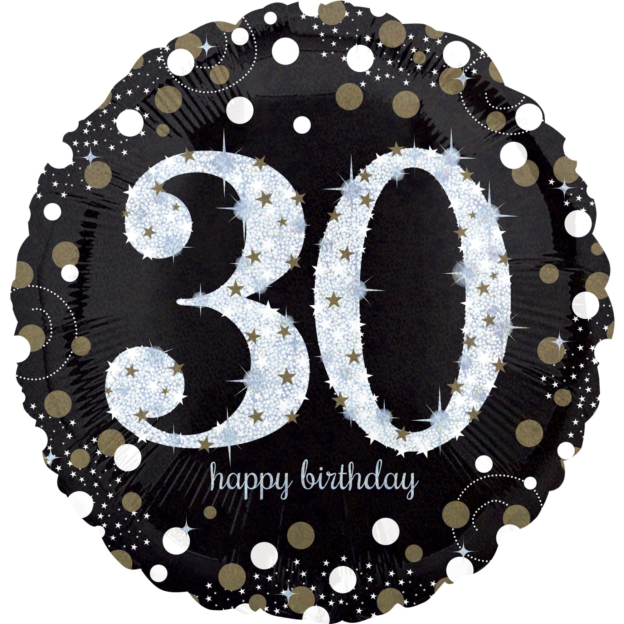 Celebrate a 30th birthday in style with this dazzling 18-inch foil balloon. Featuring a sparkling silver "30" design against a sophisticated black background, adorned with shimmering stars and dots, this balloon is perfect for marking this special milestone. Ideal for adult birthday parties, it adds a touch of elegance and fun to any celebration. Made from high-quality materials, it’s a lasting decoration that everyone will love. Inflate with helium for a floating effect to create a memorable birthday ambience.