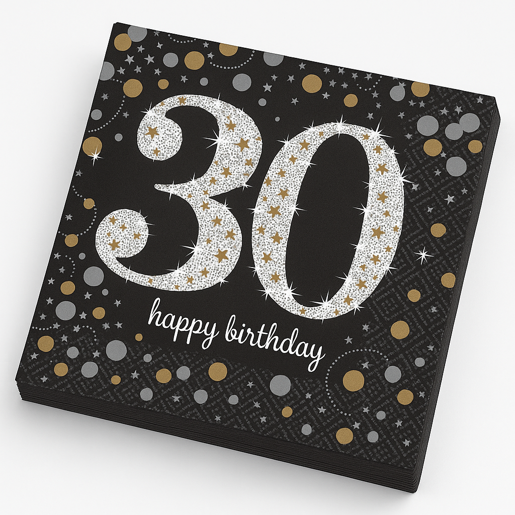 Elevate your 30th birthday party with these stylish Sparkling Celebration Lunch Napkins. Featuring a dazzling "30" design surrounded by gold and silver bubbles, these 2-ply paper napkins add a festive touch to your milestone celebration. Measuring 6.5 inches when folded, each pack includes 16 napkins, perfect for making your event memorable and elegant.