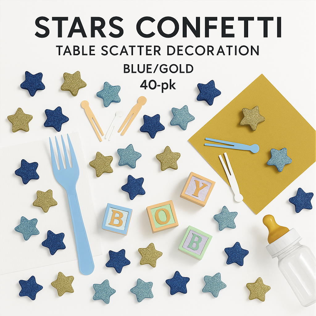 Elevate your baby shower with our Glitter Star Table Scatter Confetti in dazzling blue and gold hues. These foam stars are coated in glitter to add a touch of sparkle to your celebration. Perfect for accentuating tables with a festive pop of color, this set includes 32 pieces, ensuring there's enough to adorn your party space beautifully. Ideal for baby showers, birthdays, and any event that calls for a bit of glitz and glam.